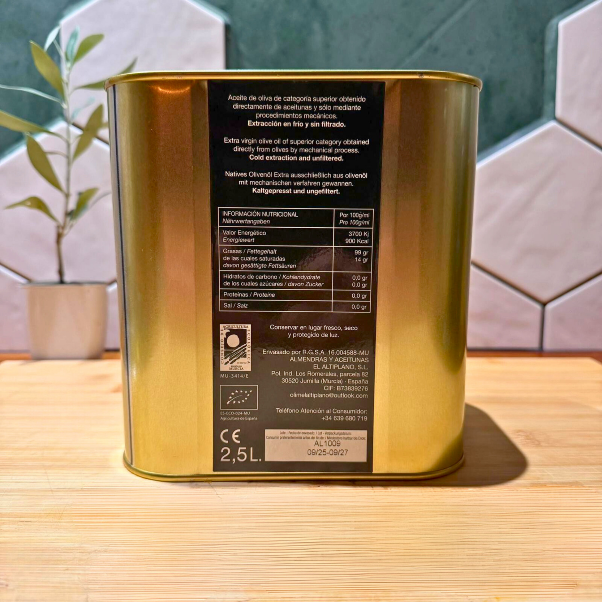 Biologische extra vierge olijfolie van superieure kwaliteit, rechtstreeks verkregen uit olijven uit de regio Murcia (Spanje), uitsluitend met mechanische procedures. Koudgeperst en ongefilterd.